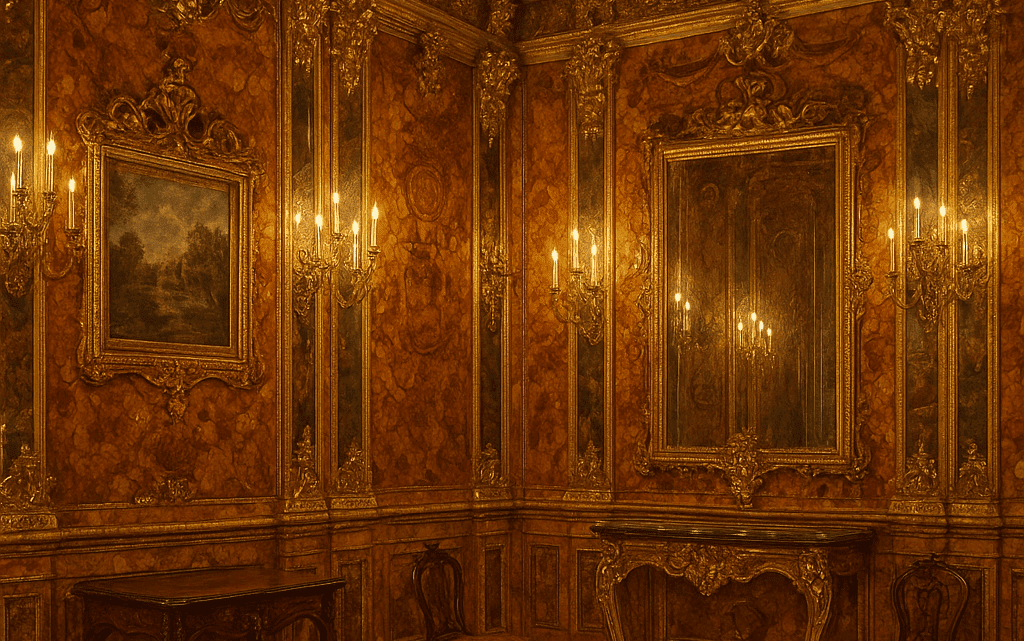 Efektem była przestrzeń o powierzchni ponad stu metrów kwadratowych, w której każde światło słoneczne odbijało się od migoczących powierzchni. Bursztynowe panele przedstawiały sceny z mitu o Apollu i Dafne, a także alegorie literatury, nauki i sztuki. Całość oprawiono w bogate ramy z cyny i złota.