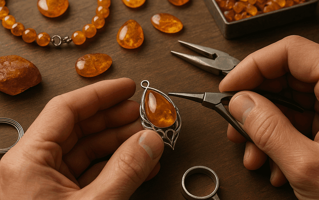 Jednym z najważniejszych etapów jest trwałe i estetyczne osadzenie bursztynu w oprawie. Do najczęściej stosowanych metod należą: